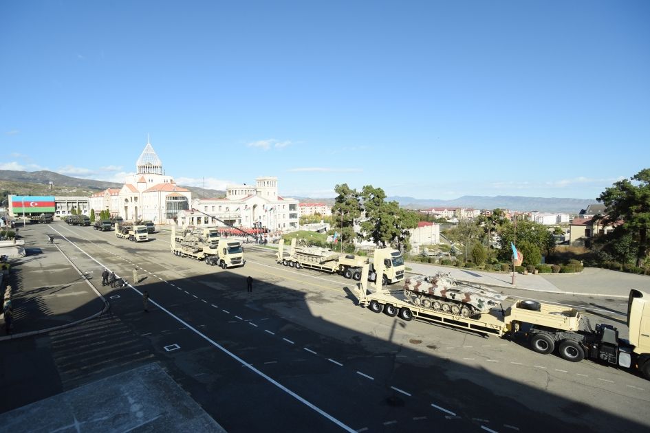 Des troupes azerbaïdjanaises et une fanfare militaire sont passées sur la place centrale de Khankendi pour marquer cette journée, près du bâtiment qui servait de quartier général aux séparatistes arméniens. Des drapeaux azerbaïdjanais ornaient le bâtiment.