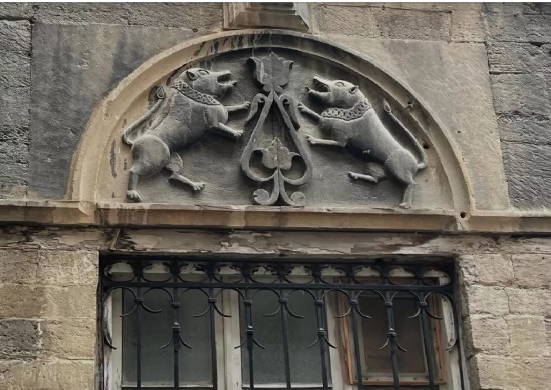 La partie centrale de la façade est mise en valeur par une imposante porte en bois ornée de profondes sculptures. Le système décoratif repose sur la répétition de motifs végétaux géométrisés, témoignant de l’influence des traditions ornementales orientales. Au-dessus des fenêtres du deuxième étage, un bas-relief expressif représente deux lions se faisant face, séparés par un élément floral stylisé.