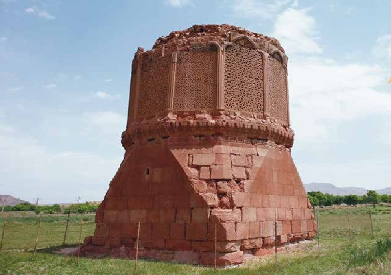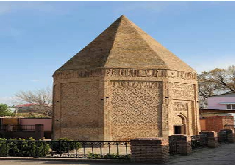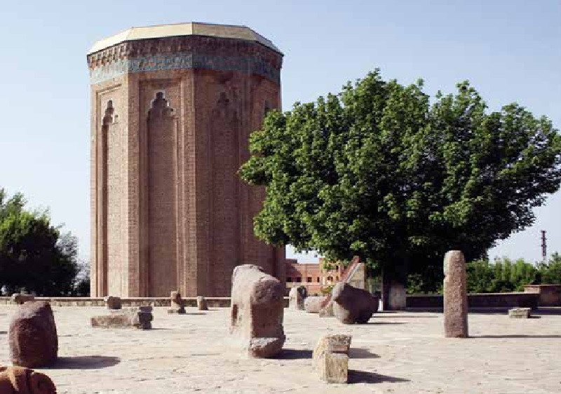 La décoration des portails d’entrée, avec leurs encadrements rectangulaires et leurs incrustations de carreaux vernissés colorés, rappelle celle du mausolée de Barda. La tour repose sur un soubassement octogonal en pierre blanche locale. À l’intérieur, elle est subdivisée en vingt niches peu profondes. Dans la partie inférieure se trouvait une crypte au dispositif original : quatre demi-voûtes en croix, pourvues de niches peu profondes et construites en grands blocs soigneusement taillés.
