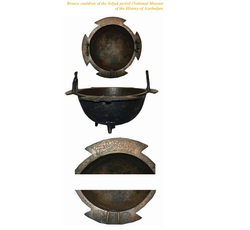 Les données archéologiques suggèrent que la diffusion de l’islam en Azerbaïdjan s’est reflétée dans la formation et le développement d’un nouveau style artistique fondé sur des principes canoniques. L’artisanat devint particulièrement varié et raffiné. On y observe clairement une combinaison de décoration et de rythme. Les ornements aux formes abstraites et aux rythmes variés devinrent une forme démocratique d’expression artistique des prescriptions spirituelles de l’islam, accessible à toutes les couches de la société (19, p. 187). Le type le plus répandu d’art décoratif et appliqué était la céramique artistique, qui manifestait clairement les caractéristiques de la culture artistique islamique de cette époque, notamment la tendance à la synthèse des arts. Elle associe harmonieusement ornements, calligraphie et peinture. Les produits céramiques émaillés de la période seldjoukide se distinguent par une ornementation artistique raffinée. Les céramiques gravées combinées à une peinture polychrome tricolore étaient particulièrement populaires. Leur décoration était dominée par une grande variété de motifs géométriques, floraux et figuratifs. On y observe souvent une combinaison réussie d’ornements géométriques et floraux. Les inscriptions sur les céramiques sont principalement réalisées en écriture coufique et naskh. Leur contenu varie des poèmes aux vœux et maximes. Les souhaits formulés en arabe étaient également très répandus. Par exemple, un bol émaillé provenant des fouilles de Beylagan porte l’inscription suivante : « Paix, prospérité… et bonheur de la part de Dieu » (20, p. 24). On trouve aussi des inscriptions associées aux noms des quatorze impeccables. En particulier, un texte de ce type a été appliqué à l’encre noire au fond d’un bol émaillé provenant de la ville médiévale de Shamkir (21, p. 115). On peut parfois observer sur la poterie des signes symboliques exprimant des vœux.