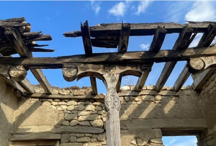 Aujourd’hui, l’espace intérieur est à ciel ouvert : la toiture a presque entièrement disparu. On distingue les poutres en bois effondrées vers l’intérieur, formant une composition à la fois chaotique et dramatique de bois assombri et de pierre. Ces vestiges permettent d’imaginer la structure d’origine : une couverture plate reposant sur de solides poutres de bois.