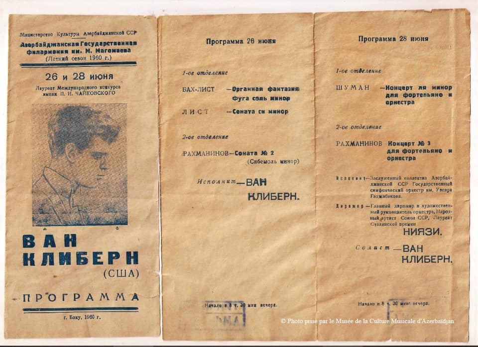 "Van Cliburn" était plus connu en Union soviétique sous le nom de Van Cliburn. Il était un pianiste américain exceptionnel, premier lauréat du Concours international Tchaïkovski (1958). Cliburn a fait des tournées dans des différents pays. En 1960, il a donné deux concerts à Bakou sur la scène de la Philharmonie d'Etat d'Azerbaïdjan Muslum Magomayev(aujourd'hui la Philharmonie académique d'État d'Azerbaïdjan au nom de Muslum Magomayev). Le premier concert était en solo le 26 juin, et le second, le 28 juin, Ce concert s'est produit avec l'Orchestre Symphonique d'État au nom d'Uzeyir Hajibeyov sous la direction de l'Artiste du peuple de l'URSS Niyazi", a déclaré le musée.
