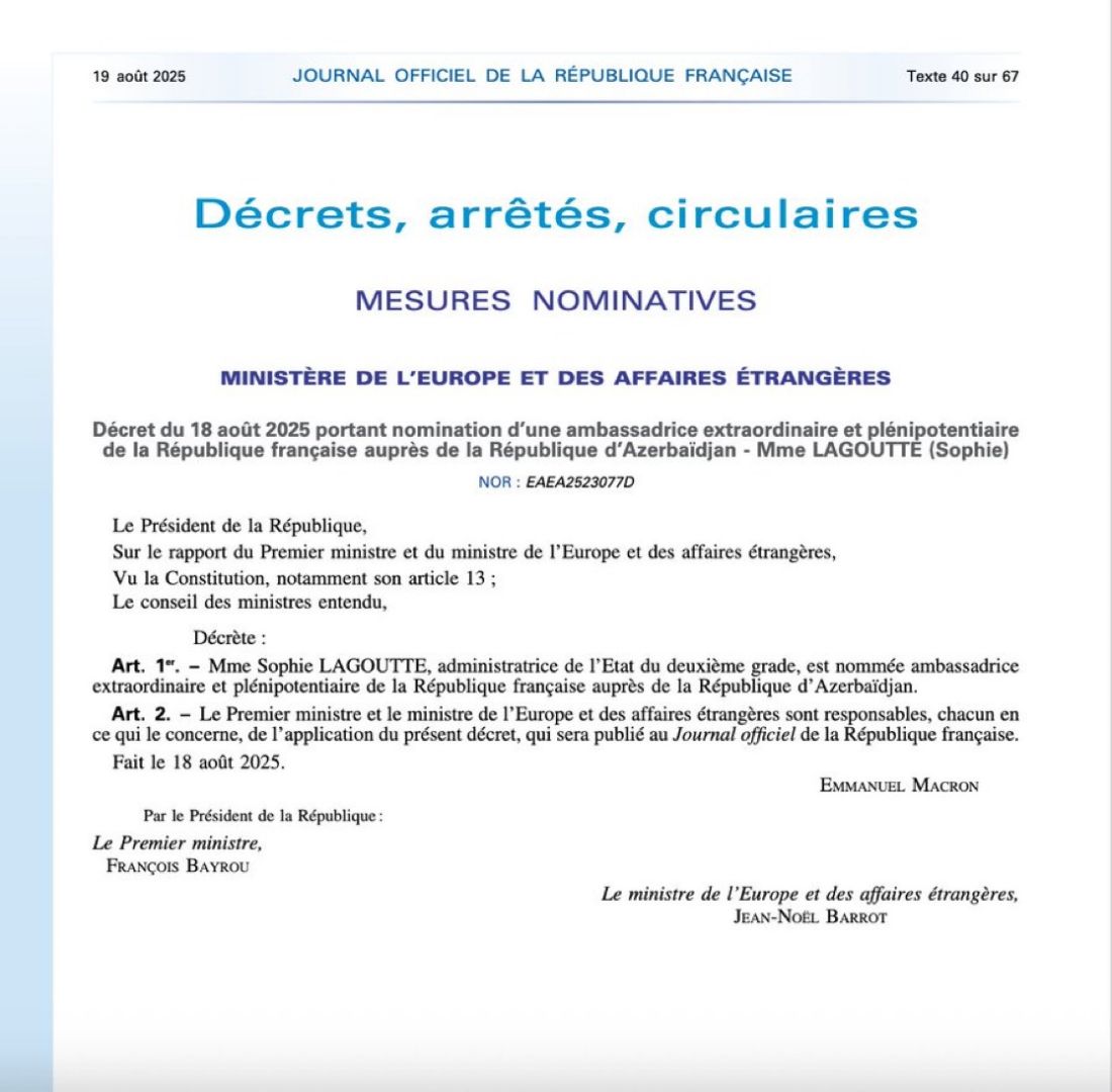 Sophie Lagoutte a également partagé une publication à cet égard . « Honneur pour moi de servir prochainement la France, nos intérêts et nos compatriotes en tant qu'ambassadrice en Azerbaïdjan, dans la lignée d'Anne Boillon.