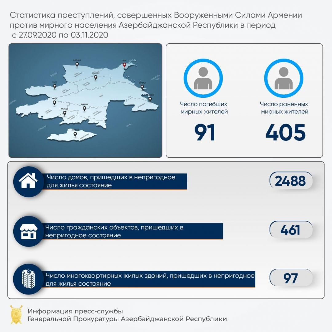 À la suite des provocations militaires commises par l'Arménie contre les Azerbaïdjanais depuis le 27 septembre dernier jusqu'à présent, 91 civils azerbaïdjanais ont été tués et 405 autres ont été blessés, a-t-on appris auprès du Parquet général de la République d'Azerbaïdjan.