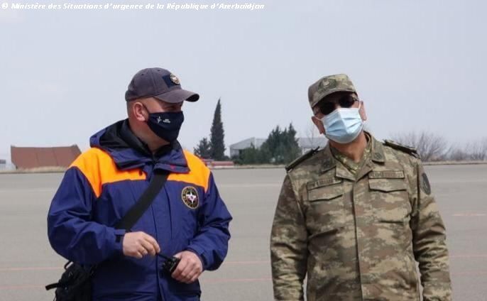 À l'Aéroport international de Gandja, les pyrotechniciens russes ont été accueillis par un représentant du Ministère des Situations d'urgence de la République d’Azerbaïdjan, le colonel Mirali Feiziyev.
