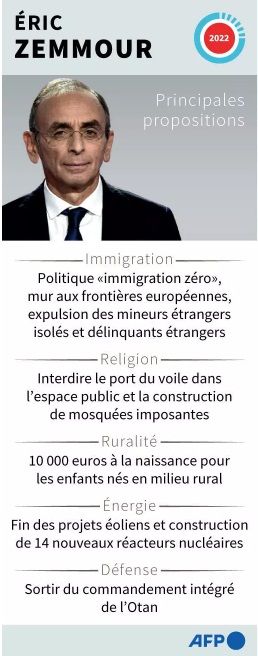 Zemmour partage de nombreuses mesures anti-immigration avec sa rivale d'extrême droite Marine Le Pen, mais pousse le curseur plus loin sur "l'identité" en mettant sur le même plan islam et islamisme ou en proposant un référendum sur l'interdiction de porter un premier prénom d'origine étrangère pour les futures naissances.