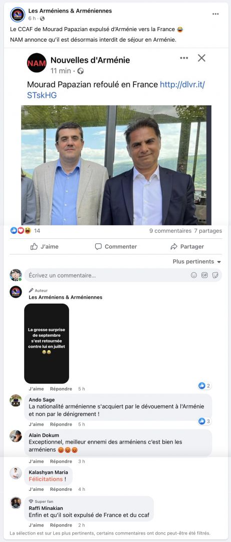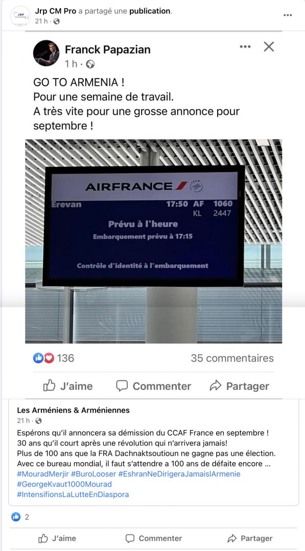 Mourad Papazian, membre du Bureau de l'ARF (Fédération Révolutionnaire Arménienne) et du CCAF (Conseil de coordination des organisations arméniennes de France), a été interdit d'entrée en Arménie. Alors qu’il arrivait à l’aéroport de Zvarnots en compagnie de son épouse, ce mercredi 13 juillet, la police des frontières de l’Arménie lui a refusé l’accès au territoire de l’Arménie, confisqué son passeport, et expulsé vers la France. Il a lui également été notifié son interdiction de séjour en Arménie.