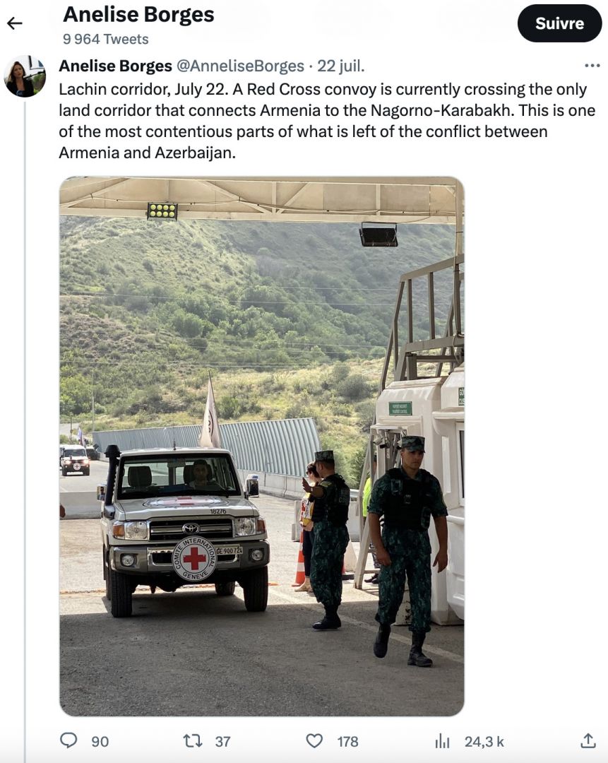 La journaliste d'Euronews Annelise Borges, qui s'est rendue sur place a constaté, dans un tweet que les camions de la Croix-Rouge traversaient sans encombre le check Point, ce qui lui a d'ailleurs valu des insultes et menaces de la part des activistes arméniens.