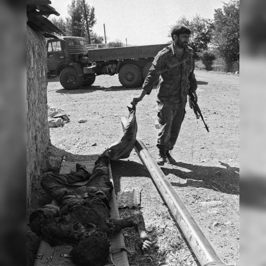 Guliyev Ganimat, et 4 personnes de sa famille ont été tuées avec lui. Quand il a levé les mains et s'est rendu, les Arméniens lui ont dit que non, tu ne te rends pas. Ils lui ont fendu la tête avec une hache. Puis ils ont tué sa femme de la même manière. »