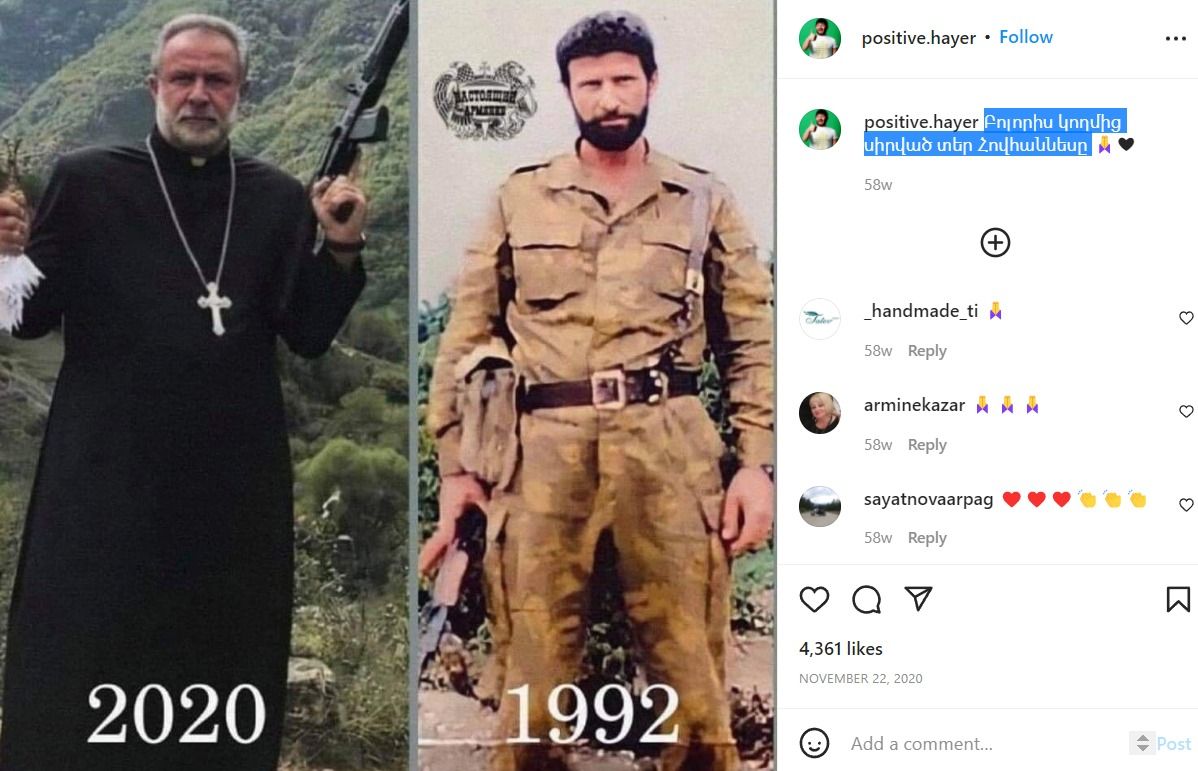 1. Deux photograhies du Père arménien, Hovhannès Hohannissyan au cours des deux guerres du Karabakh (1992 et 2020)