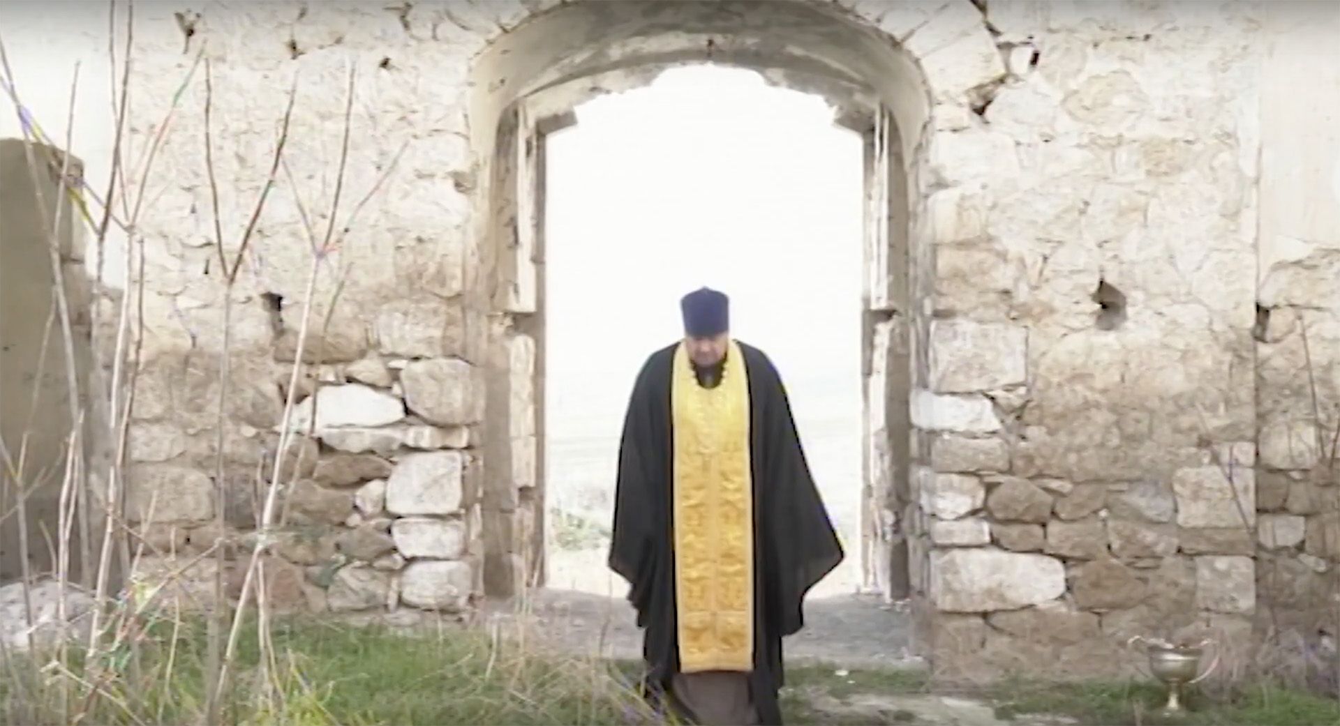 Evêque orthodoxe devant l'église de Khodjavend détruite pendant l'occupation