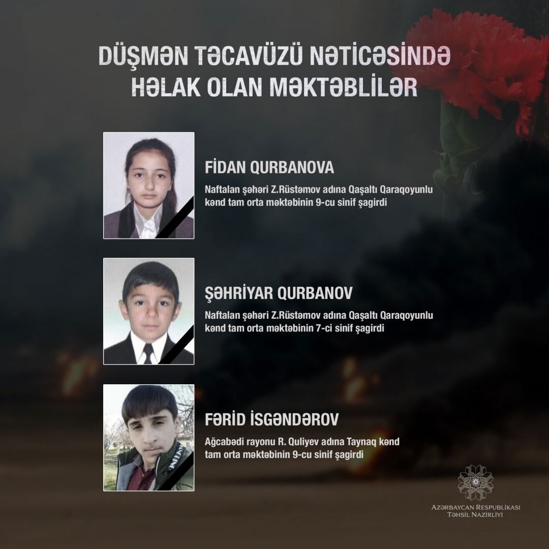 Comme indiqué, trois écoliers, tels que Fidan Gourbanova, élève de 9e année de l'école du village de Gashalti - Garagoyunlu de la ville de Naftalan, Chahriyar Gourbanov, élève de 7e année de la même école et Farid Iskenderov, élève de 9e année de l'école secondaire du village de Taïnag de la région d'Aghjabedi ont été tués lors des bombardements arméniens.