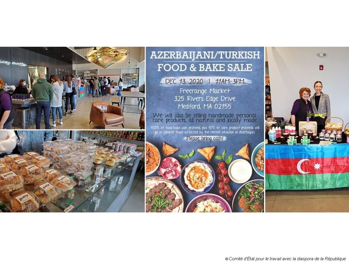 « Pendant l'action qui s'est tenue au « Freerange Market » a été organisée la vente d'échantillons de la cuisine nationale azerbaïdjanaise et turque, préparés à l'initiative des femmes azerbaïdjanaises. En montrant l'unité et la solidarité des diasporas azerbaïdjanaise et turque, le propriétaire du magasin Jenk Emre a mise en place toutes les conditions pour que nos compatriotes puissent organiser cet événement caritatif », selon la source.